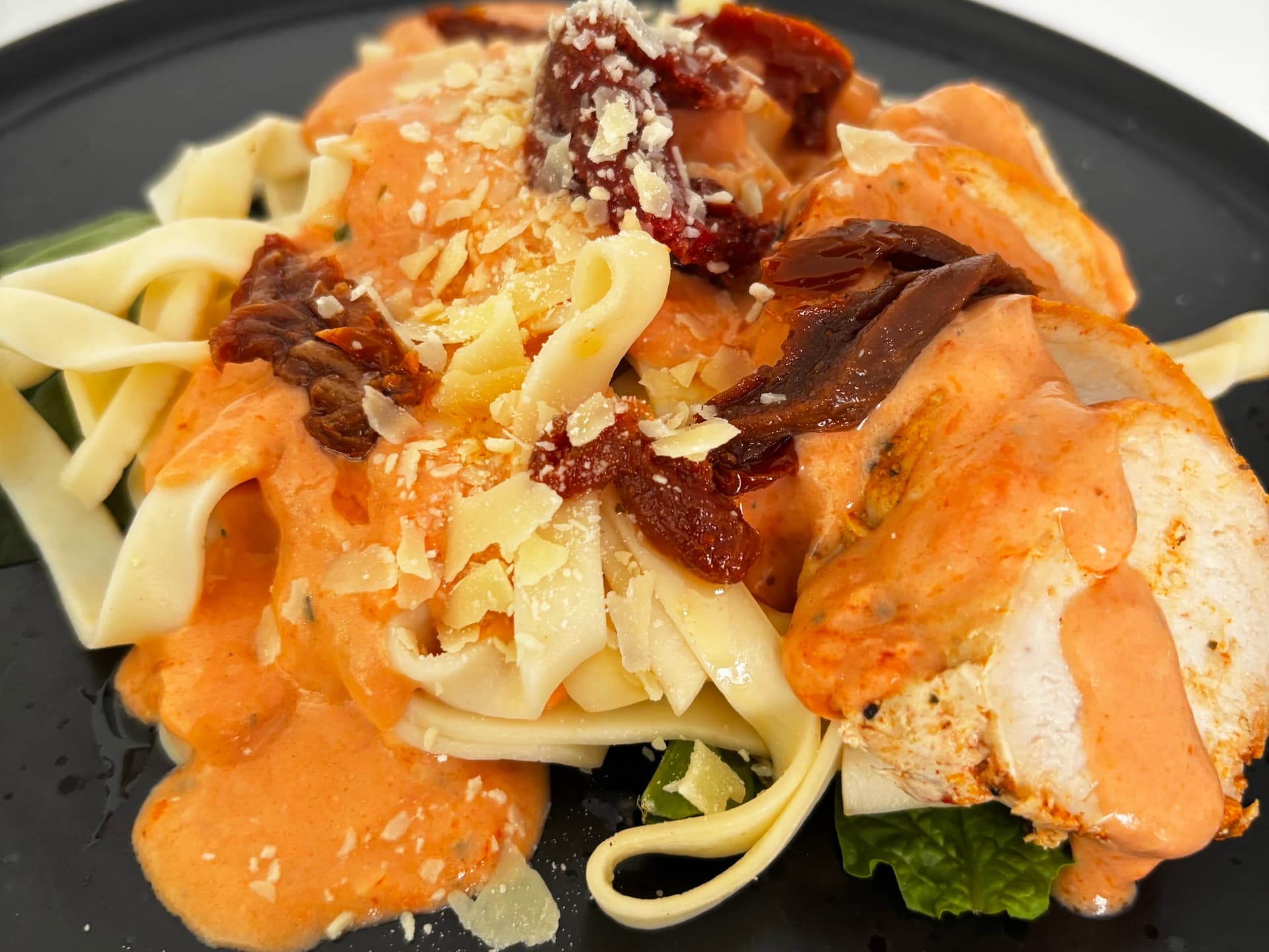 Chicken & Fettuccine in Mouthwatering Creamy Tomato Sauce, Spinach & Sun-dried tomatoes. Garnished with Parmesan Cheese & Parsley.