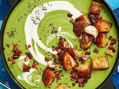 Cream of broccoli soup with bacon and garlic croutons served on the side for an easy GF option.