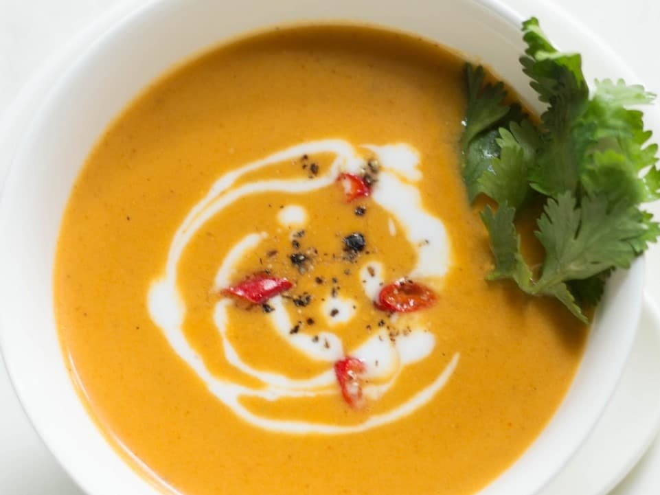 This Thai pumpkin soup with coconut milk is the ultimate winter warmer. Served with red chili, fryed shallots and coriander as a garnish.