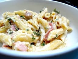 Creamy and delicious carbonara pasta sauce with penne, bacon, cream, pecorino and parmigiana cheese.