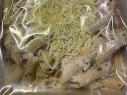 Cream (Milk), Penne pasta (Wheat, Egg), Onion (diced), Bacon (diced), Parmesan (grated) (Milk), Chives, White wine, Vegetable stock (Booster, GF Vegan), Pepper