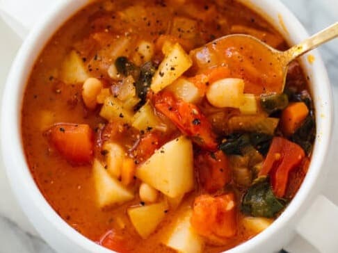 Warm up with this hearty and delicious soup, packed full of vegetables and flavour. *Please note that the soup is vegan without the parmesan that is provided separately as a garnish