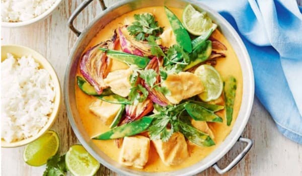 Coconut based yellow curry with diced local white fish and vegetables.Garnished with Fesh Corriander.