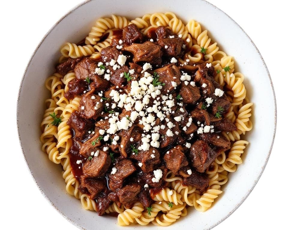 Slow-braised lamb in a rich red wine and herb sauce, served with risoni pasta.