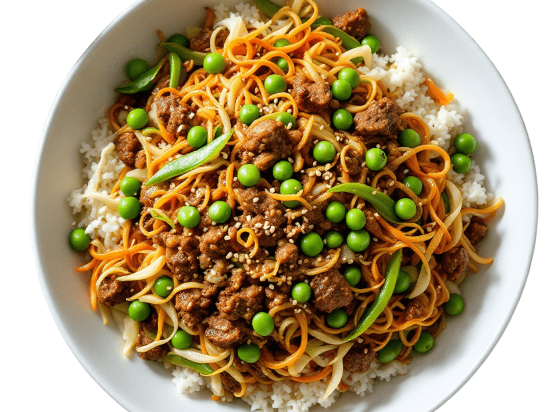 Classic stir-fried beef with noodles and vegetables, served alongside fluffy rice.