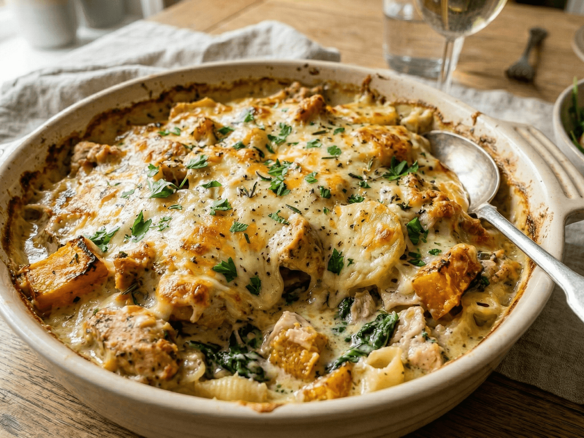 Tuna, pumpkin and spinach in a creamy seasoned sauce baked through pasta.