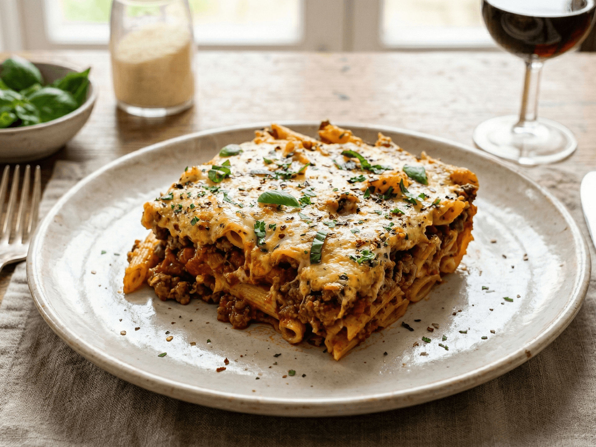 Rich tomato beef mince sauce baked through pasta with herbs and cheese.