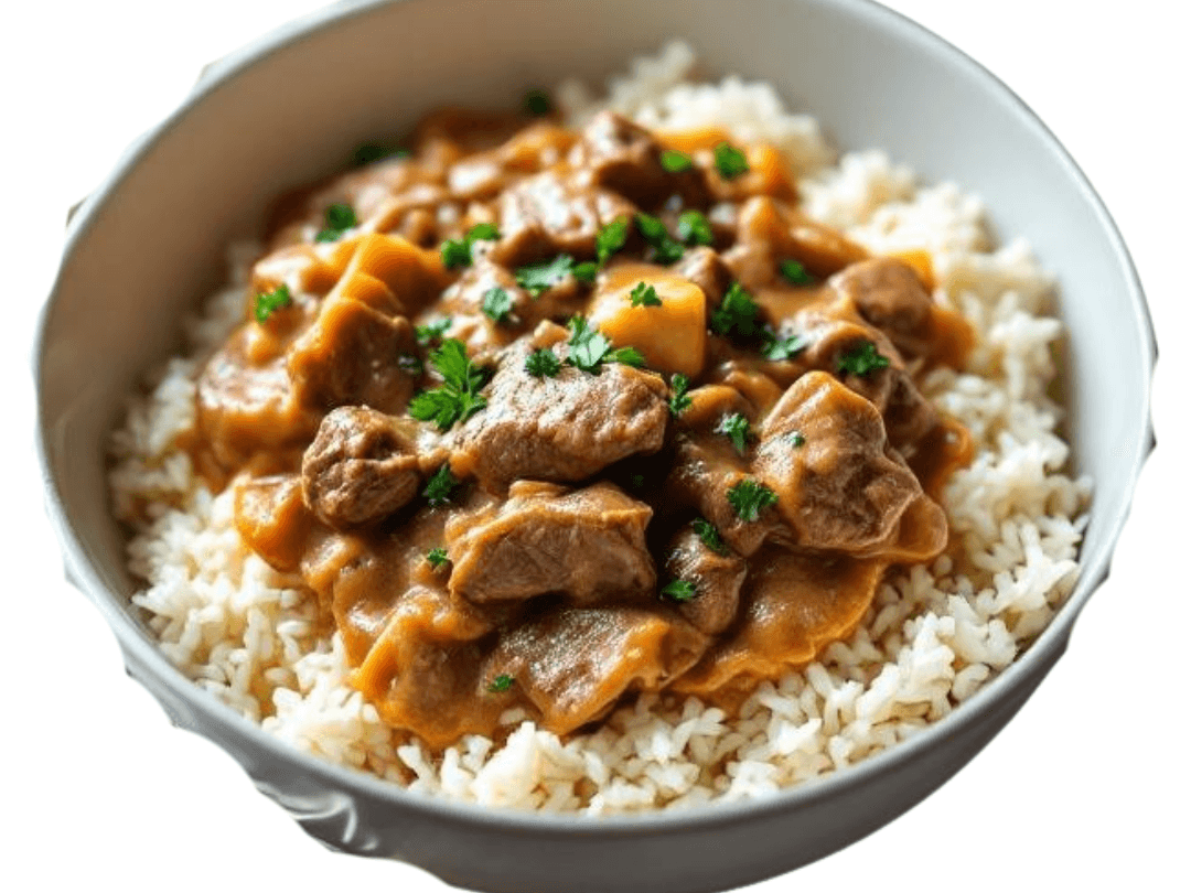 Tender beef strips in a creamy mushroom sauce, served with rice for a warming favourite.