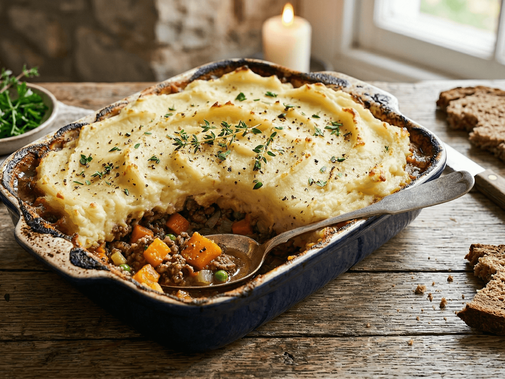 Rich seasoned beef mince with vegetables and pumpkin, topped with creamy mashed potato for a hearty homestyle meal.