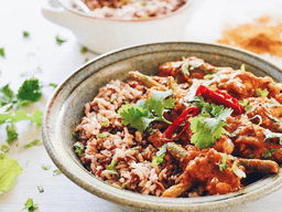 Chicken thighs, Basmati rice, Curry base (Crustacean, Fish), Chicken stock, Crushed tomatoes, Carrots, Beans, Broccoli florets, Wild rice, Chickpeas, Coconut milk, Rice bran oil, Rogan josh sauce, Garam masala, Salt, Pepper