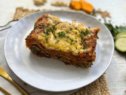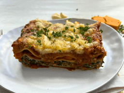 Layers of fresh gluten-free lasagne sheets are nestled between a rich, veggie- and lentil-packed tomato ragù, then finished with a creamy spinach and vegan ricotta blend for a comforting, wholesome classic — completely plant-based and full of flavour.