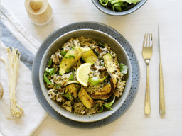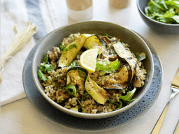 Herby, "creamy" plant-based risotto of 3 mushrooms. Topped with grilled zucchini for added greenness and flavour!