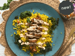 Portugese Rice [Frozen peas, Broccoli, Red onion, Basmati rice, Red capsicum, Kale, Turmeric powder], Portugese Seasoning [Rice bran oil, Sweet paprika, Garlic powder, Oregano, Coriander, Lemon juice, Coconut sugar, Pink salt], Slaw [Perinaise, Red cabbage, Green cabbage, Carrots, Red onion]