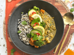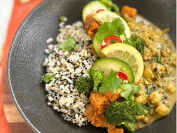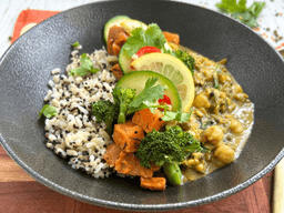 Coconut milk, Brown rice, Sweet potato, Crushed tomato, Cinnamon quills, Broccoli florets, Chickpeas, Mung beans, Onion, Garlic, Ginger, Broccoli, Pumpkin, Zucchini, Red split peas, Spinach, Black quinoa, Curry powder, Rice bran oil, Cumin seeds, Pink salt, Vegetable stock (GF), Curry leaf