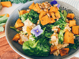 The perfect pair: pumpkin and sage hit the stage with this springtime risotto. Topped with our herby kale crumble and roast pumpkin seeds for added texture, crunch and omegas!