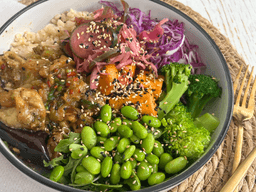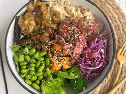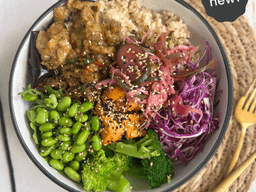 The holy trinity of sticky, sweet, and spicy all in one bowl. Eggplant, pulled in a glossy miso glaze, balanced with a kick of heat and a hint of caramelised sweetness. Served over sushi brown rice, veg pickle and crunchy veg. It’s a nourishing, umami-packed bowl that’s as comforting as it is crave-worthy.