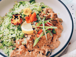 Sauteed tofu and mixed vegetables smothered in a rich, creamy, satay peanut sauce with a light, fluffy and flavoursome broccoli rice. Layered with fresh herbs and tonnes of peanutty love.
