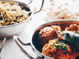 Homemade cauliflower and cashew balls, braised in a mild Indian gravy and served with a healthy side of the most delicious pilaf you've ever had in your life!