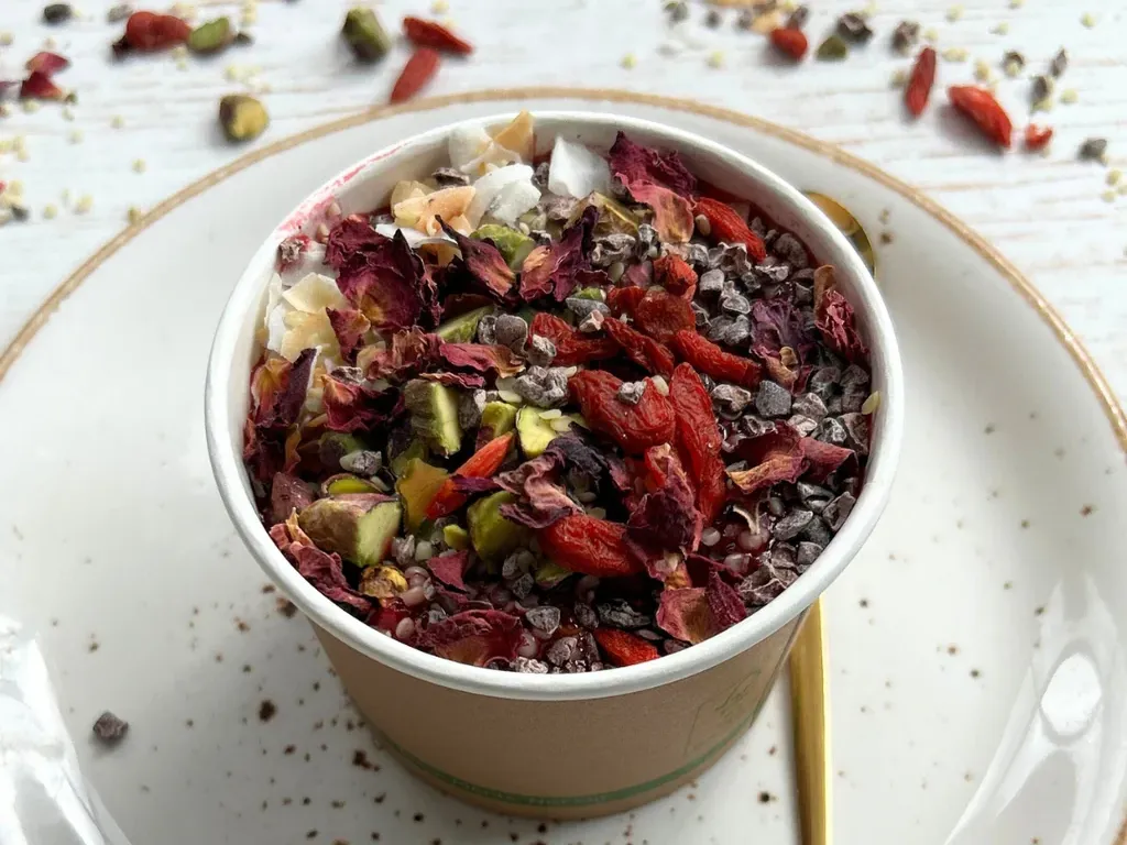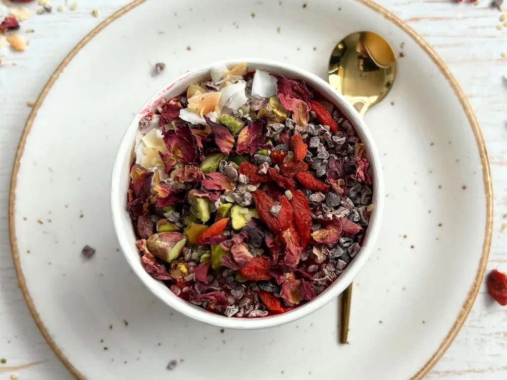 Loaded with all the good stuff! This fresh breakfast bowl is packed with chia seeds, hemp seeds, goji berries and topped with vibrant fruits and crunchy nuts. Whether you're at home or on the go, it's the perfect way to fuel your day and fill your belly with wholesome, supercharged energy!