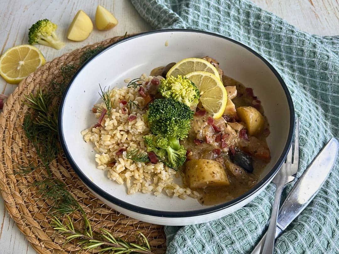 Slowly simmered lemon is the key to this beautiful Greek-style dish. Layers of fresh vegetables hidden among pieces of succulent chicken fillet, cooked in lemon and aromatics like oregano, thyme and parsley.