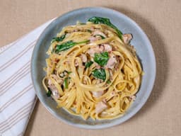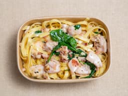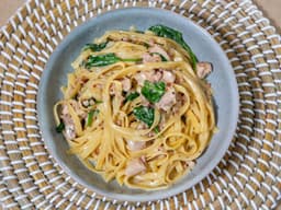 Chicken thighs, Cream (Milk), Pasta (Wheat), Bacon - Diced, Spinach, Parmesan (Milk), Table salt, Cracked Black Pepper